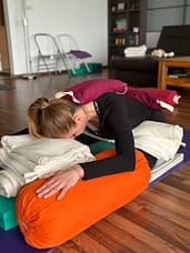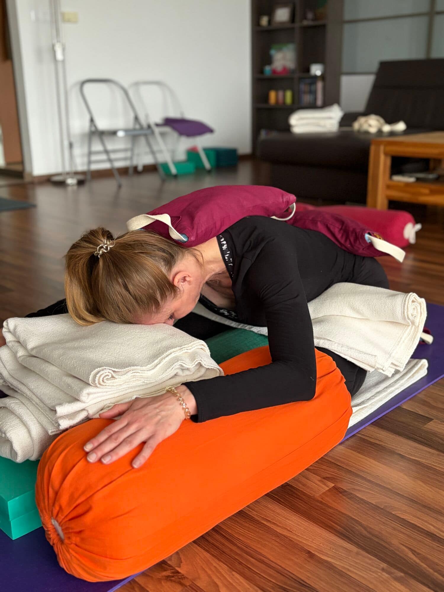 V rámci programu “PUSTI TO” používam pre uvoľnenie tela záťaže ako pieskové vaky, drevené bloky a bolstre (jogové valce), ktoré špeciálne umiestňujem na časti tela tak, aby sme povolili nahromadené napätie.
